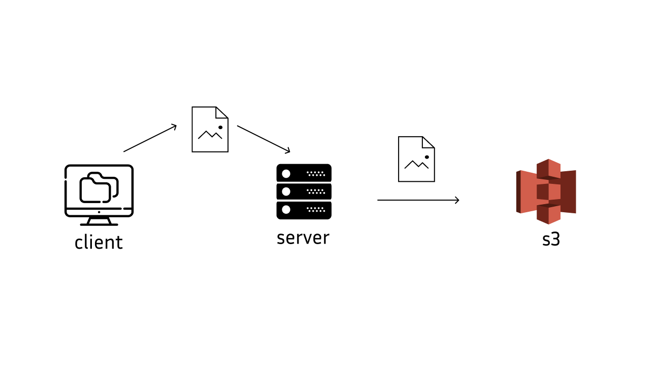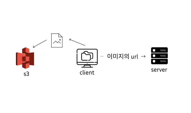 기존의 이미지 등록 방식은 위와 같았다. 클라이언트는 서버에 직접적으로 이미지 파일을 전달하고, 서버는 이를 s3 에 전달해 이미지를 저장했다. 그러나 이는 이미지 파일을 직접 서버에 전달하기 때문에 서버에 부하가 발생할 수 있다.