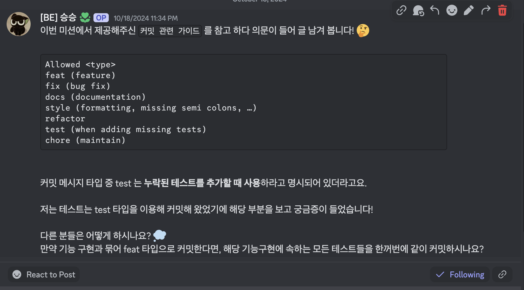 이에 세 분의 댓글이 달렸고, 정리해보자면 공통적으로 기능 구현이 정상 작동하는지 확인하는 것까지 하나의 흐름이기에 같이 커밋해야 한다는 의견이었다. 이 의견에 나 역시 동의하여 앞으로는 해당 부분을 참고해야겠다는 생각을 했다.