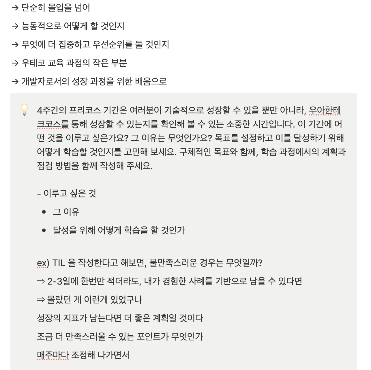 나는 여기에 정말 정말 솔직하게 적었다. 프리코스는 4주간의 과정이다. 이는 우테코에 합격하기 위한 발판이기도 하지만, 내가 긴 시간 투자를 하는 과정이기도 하다. 그렇기에 정말 내가 지킬 수 있는 목표, 최소한 4주만큼은 내가 이것들은 얻어내고 싶다 하는 것들을 작성했다.