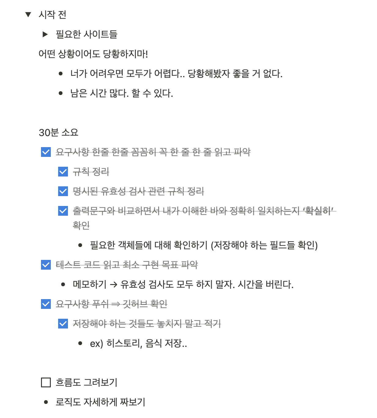1차 합격 발표가 난 뒤에는, 화수목금 4일동안 매일매일 기출 문제를 모여서 풀었다. 사실 나는 꼼꼼하게 구현 사항들을 정리하지 않고 냅다 개발에 뛰어드는 편이었다. 그래도 항상 테스트는 다 통과가 됐기에 별 문제가 없을 것이라고 자만했던 것도 같다.