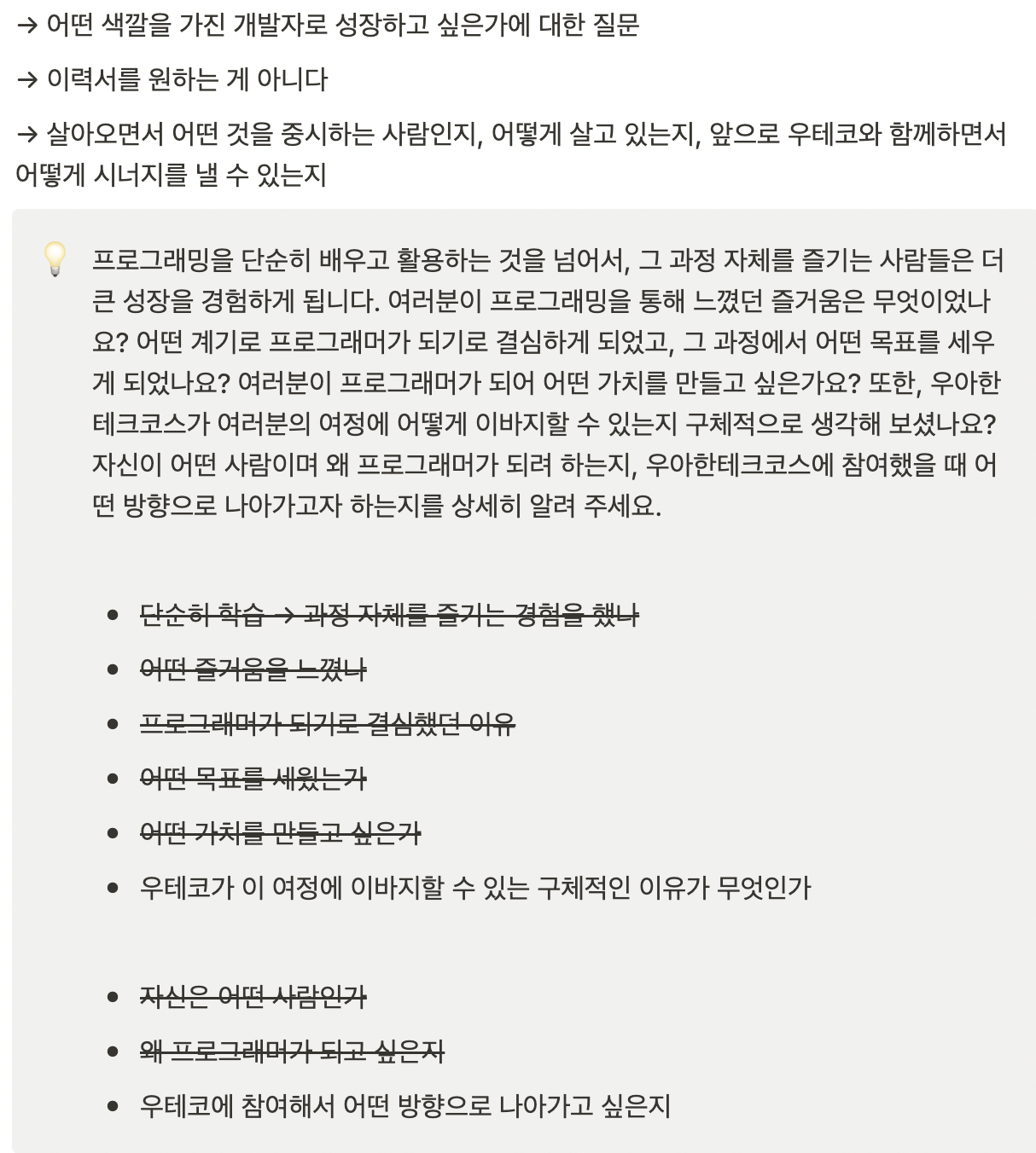 마지막으로 핵심은 자신이 개발자로서 갖고 있는 가치관이 왜 꼭 우테코에서만 실현시킬 수 있는지가 담겨야 한다고 나는 분석했다.