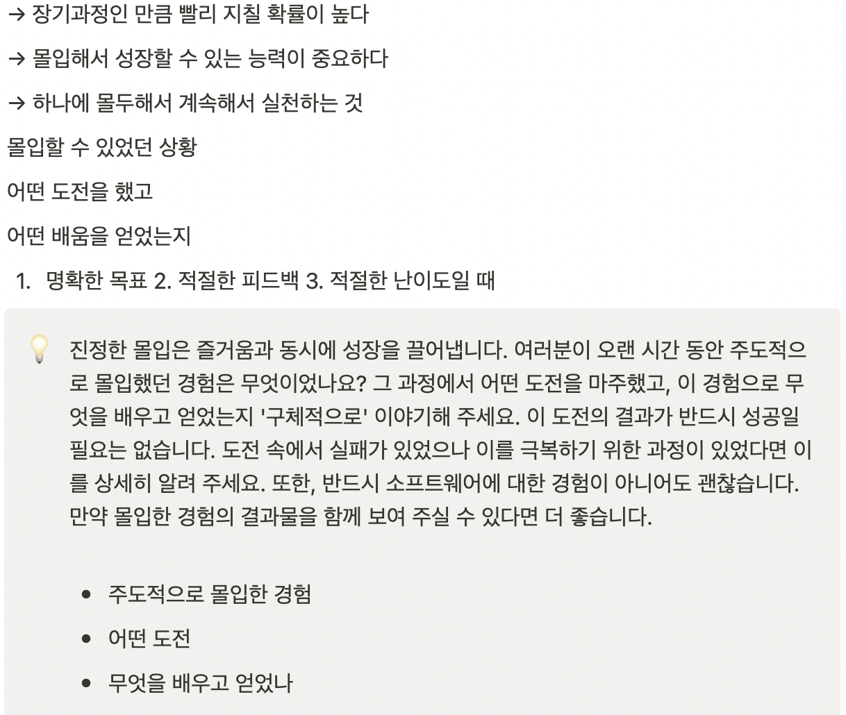 몰입! 몰입을 왜 물어볼까에 대해서도 잘 생각해봐야 한다. 우테코는 1년이라는 긴 시간이며 오프라인 과정이고, 길게 잘 몰입하지 못하는 사람을 뽑았다가는 우테코 입장에서 타인의 기회를 빼앗을 수도 있는 것이다. 그렇기에 내가 1년동안 몰입할 수 있는 사람인가를 잘 보여줘야 한다고 생각했다.