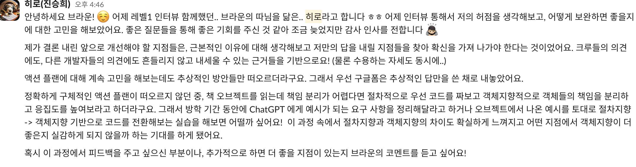 인터뷰 과정에서 개선하기 위한 액션 플랜을 세우고, 원한다면 브라운에게 점검 받아 보라는 이야기를 들었다. 나의 경우에는 직접적으로 경험해볼 것 + 다양한 것들에 의문을 갖고 = 나만의 기준을 세워 철학을 가질 것을 느꼈기 때문에 위와 같이 브라운에게 메시지를 남겼다.