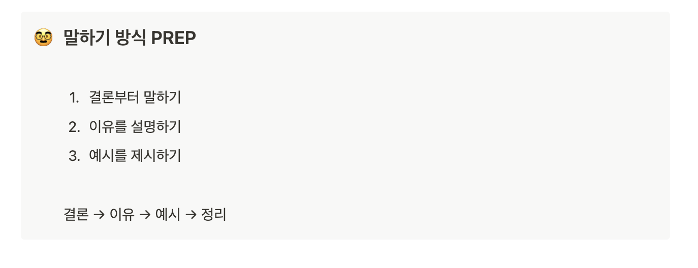 무엇보다 말하는 순서가 정해져 있으니 무의식적으로 구조적인 생각이 잡혔던 것 같다. 또한 결론을 먼저 이야기를 하게 되니 내 이야기의 방향이 잡혔다. 예시를 이야기하다 보면 어차피 내가 정말 겪었던 것들이니까 술술 설명할 수 있었다.