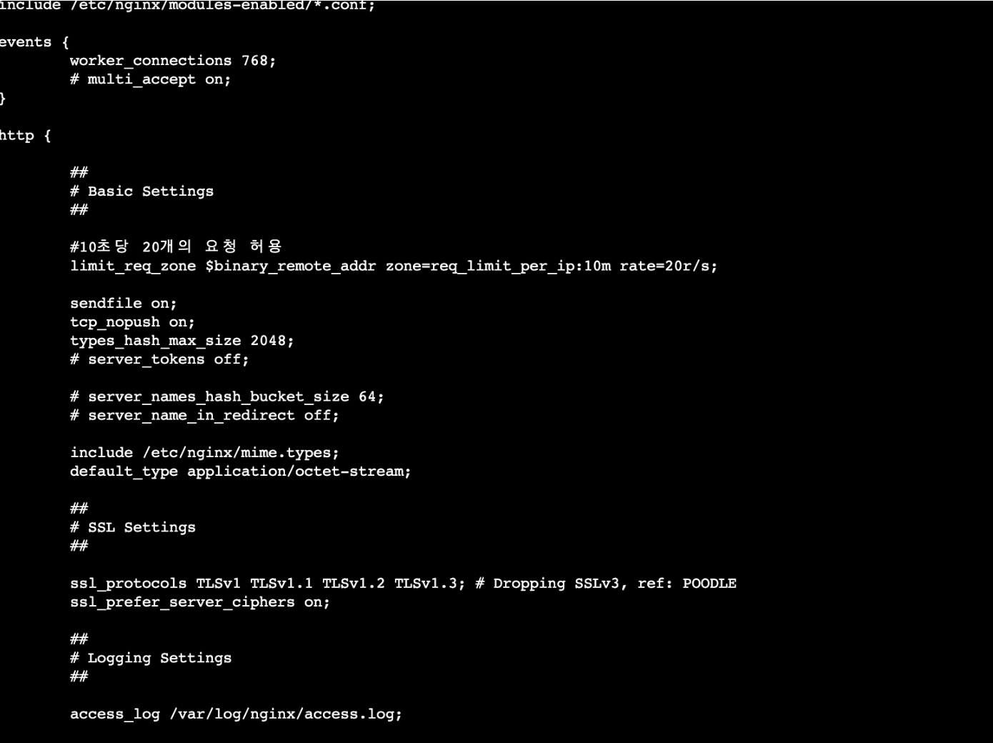 ์ด๋ 1์ด๋น 20๋ฒ์ ์์ฒญ๊น์ง๋ ํ์ฉํ๋ ์ค์ ์ด๋ค. $binary_remote_addr ๋ ์์ฒญ์ ๋ณด๋ด๋ ํด๋ผ์ด์ธํธ์ ip ์ ํด๋นํ๋ค.