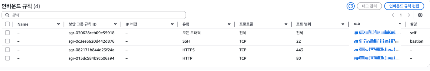 ๋ํ 443 ๊ณผ 80 ์ ๋ํด์๋ ๊ธฐ์กด๊ณผ ๊ฐ์ด ๋ชจ๋ IP ๋ก๋ถํฐ์ ์ ๊ทผ์ ํ์ฉํ๋ ๊ฒ์ด ์๋๋ผ ํน์ ec2 ์ ๋ํด์๋ง ์ ๊ทผ์ ํ์ฉํ๋ค.