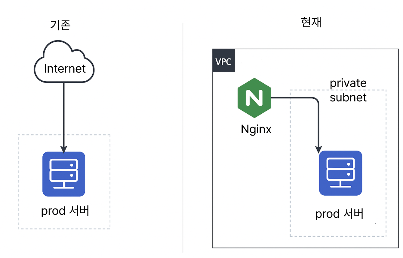 ๊ทธ๋ฌ๋ prod ์๋ฒ๋ฅผ ๊ตฌ์ถํ๋ฉฐ ๋ณด์์ ๊ณ ๋ คํ๋ ๊ณผ์ ์์๋ prod ์๋ฒ๋ฅผ VPC ๋ด๋ถ์ private subnet ์ผ๋ก ์ฎ๊ธฐ๊ธฐ๋ก ๊ฒฐ์ ํ๋ค.