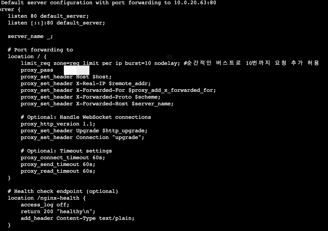 - proxy_set_header X-Real-IP $remote_addr; → ํด๋ผ์ด์ธํธ์ ์ค์ IP ์ ๋ฌ.
