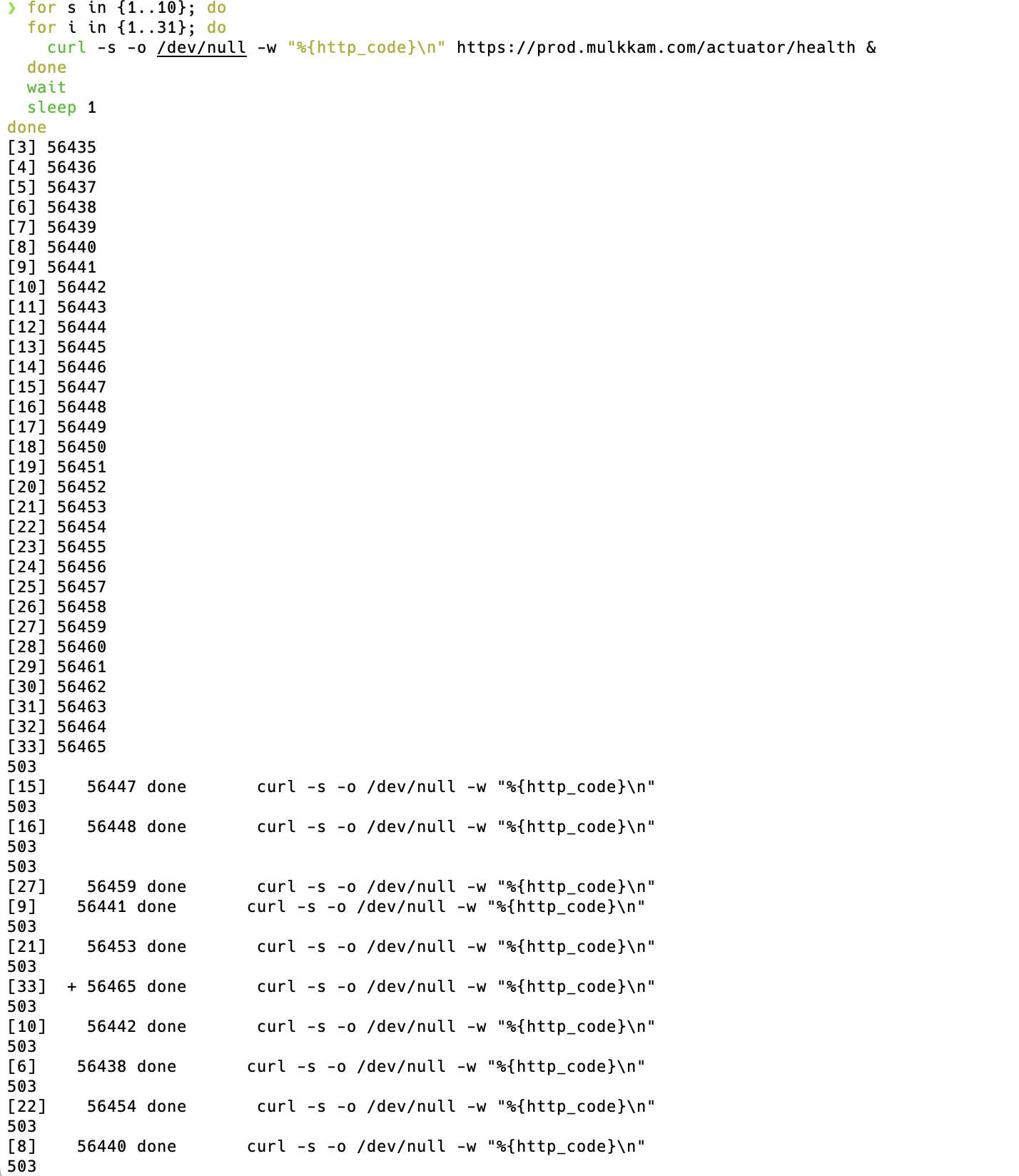 ์ ์ค์ ์ด ์ ์ ์ฉ๋๋์ง ํ์ธํ๊ธฐ ์ํด์ ์์ ๊ฐ์ด ์ค์ ๋ก ์์ฒญ์ ์ด๋ณด์๋ค. ์ด๋ 31๊ฐ์ ์์ฒญ์ ์ด๋ง๋ค ์๋ ๊ฒ์ด๋ค. ๊ฐ๊ฐํ 503 ์ด ์ํ ์ฝ๋๋ก ๋ฐํ๋๋ ๊ฒ์ ํ์ธํ ์ ์๋ค.