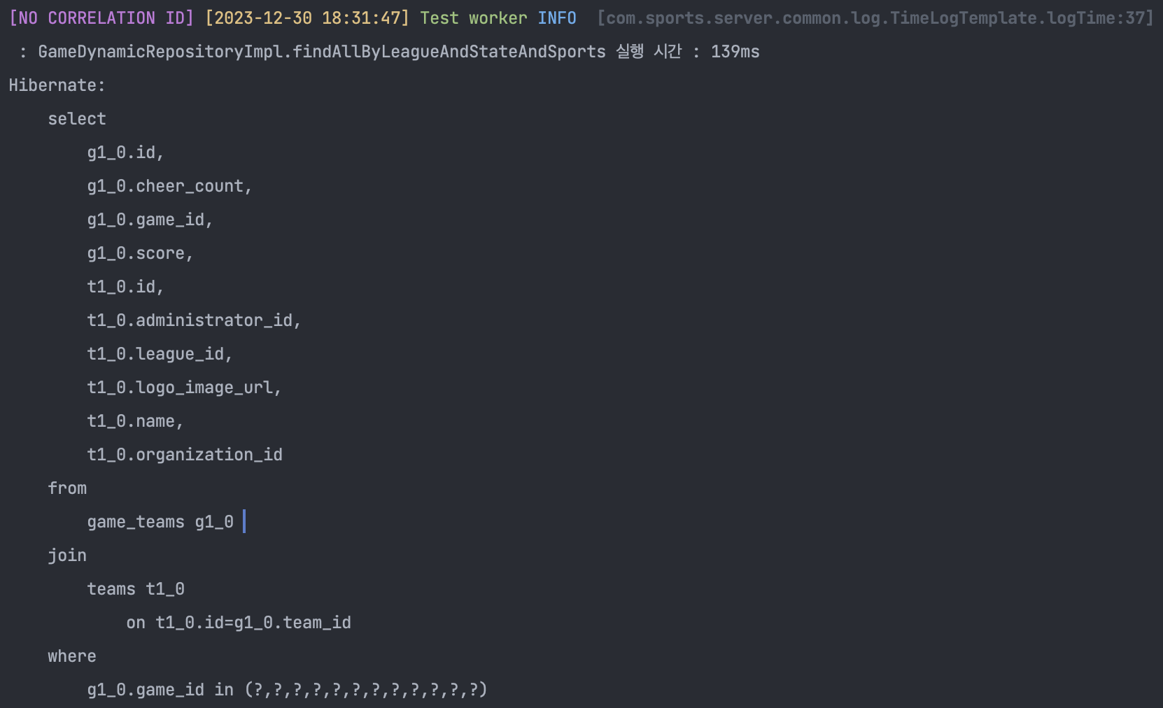 ํ์ฌ games, ์ฆ ๊ฒฝ๊ธฐ๋ค์ ๋ํด์ ๋ฐ๋ณต์ ์ผ๋ก ํด๋น ๊ฒฝ๊ธฐ์ ์ฐธ์ฌํ๊ณ ์๋ ํ๋ค์ ์ฐพ์์ id ์์ผ๋ก ์ ๋ ฌํ์ฌ dto ์ ์ธ์์ ๋ฃ๊ณ ์๋ค. ์ด ๊ณผ์ ์์ GameTeam ์ id ๋ฅผ ์กฐํํ๊ฒ ๋๋, ๊ฒฝ๊ธฐ ํ๋ ๋น (1) ๊ฒฝ๊ธฐ์ ์ฐธ์ฌํ๋ ํ์ ๊ฐ์๋งํผ (N) ์ฟผ๋ฆฌ๊ฐ ์ฌ๋ฌ๊ฐ ๋๊ฐ๊ฒ ๋๋ ๊ฒ์ด๋ค.