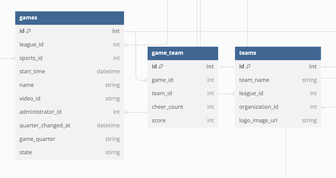 ์ฐ์ , games ์ game_teams ๋ ์์ ๊ฐ๋ค.